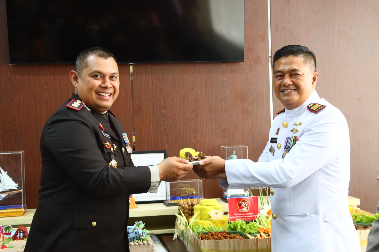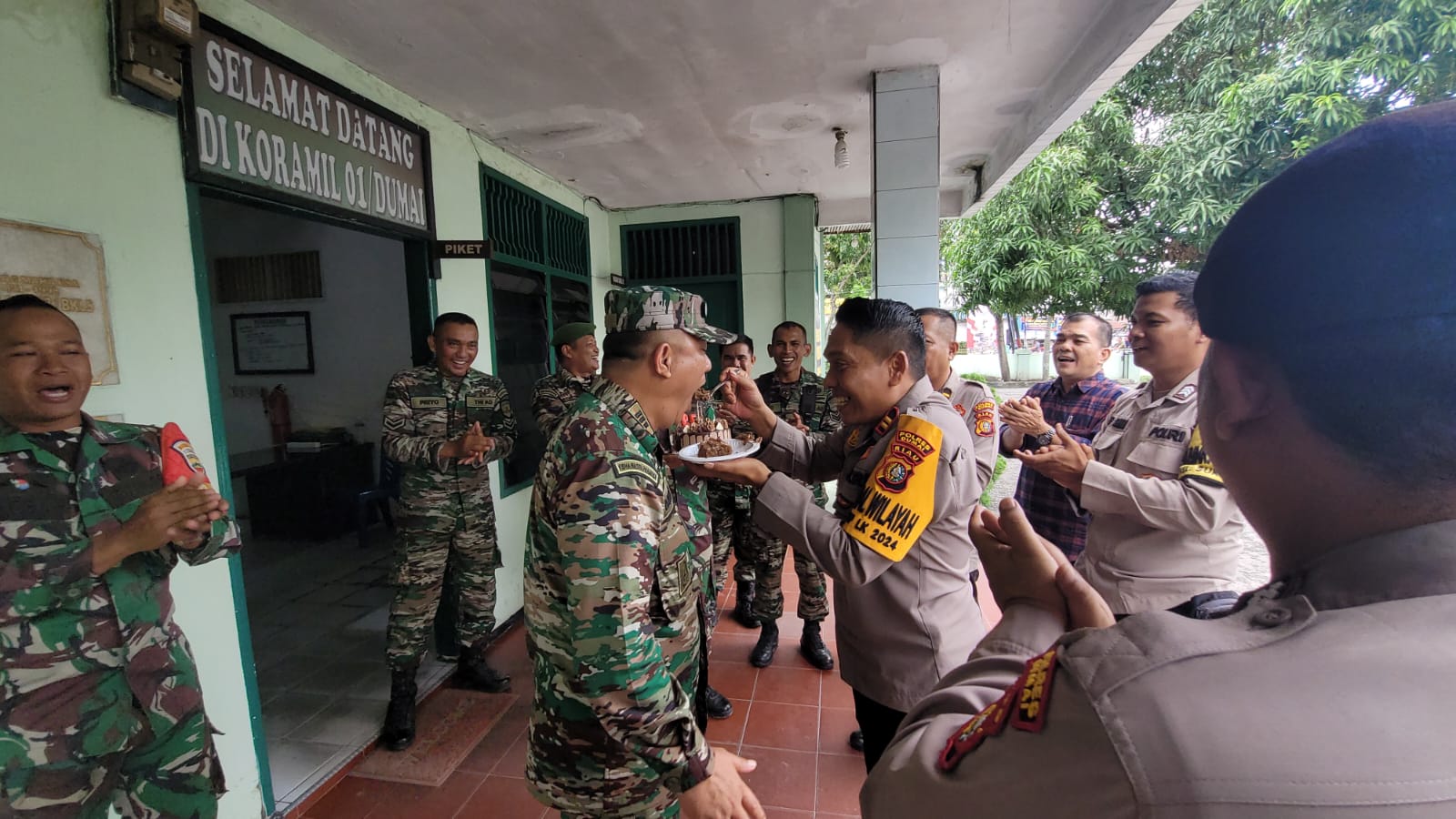 Dalam kesempatan ini, Kapolres Dumai menyerahkan nasi tumpeng dan kue ulang tahun sebagai simbol peringatan HUT TNI ke-79 dan sebagai bentuk penghormatan kepada rekan-rekan TNI.