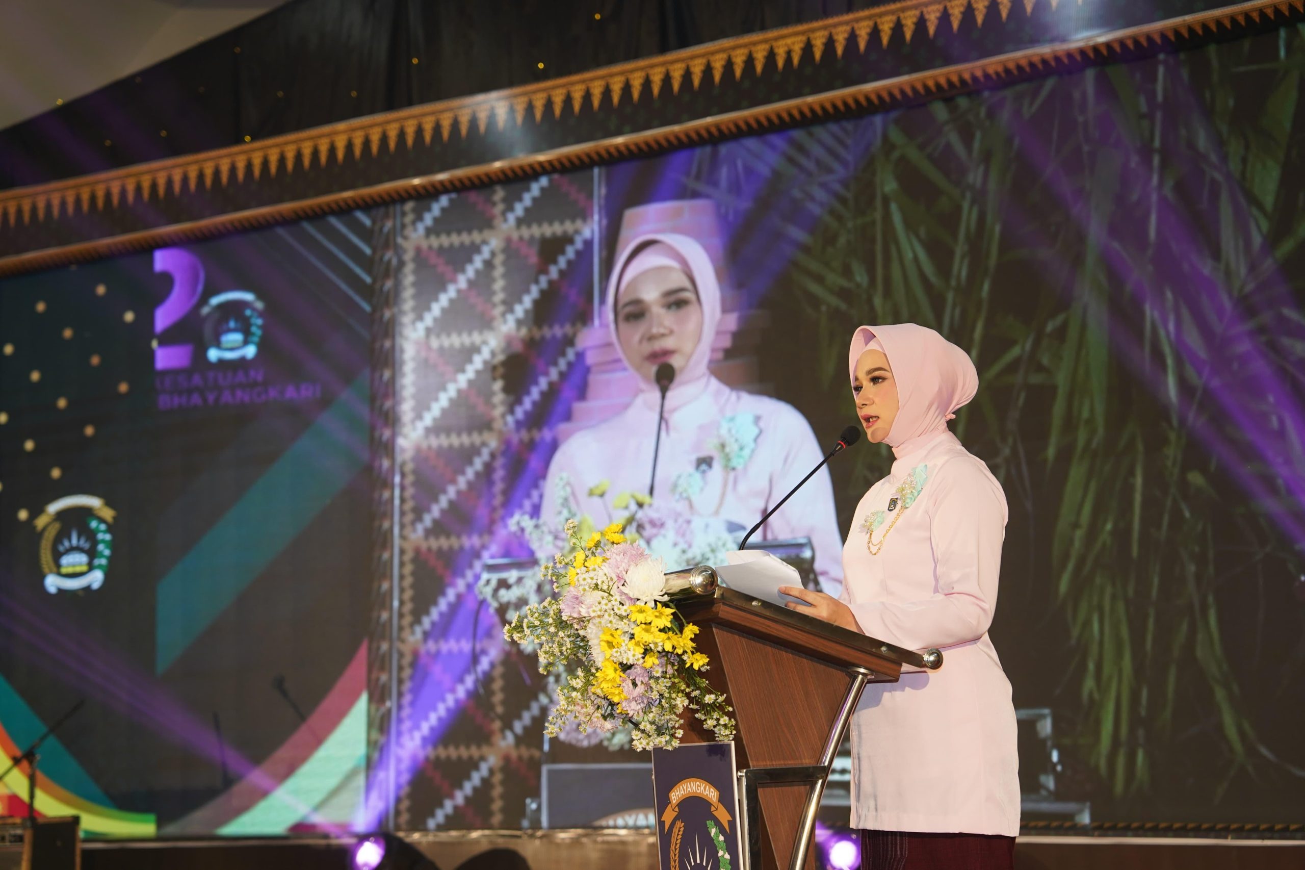 Ketua Bhayangkari Daerah Riau Ny. Nindya M. Iqbal dalam sambutannya menyampaikan, Kami telah mengikuti upacara puncak peringatan Hari Kesatuan gerak Bhayangkari ke 72 tahun 2024 secara security dengan pengurus pusat Bhayangkari dan kegiatan ini dipimpin langsung oleh ketua umum Bhayangkari dan juga Pembina utama Bhayangkari.