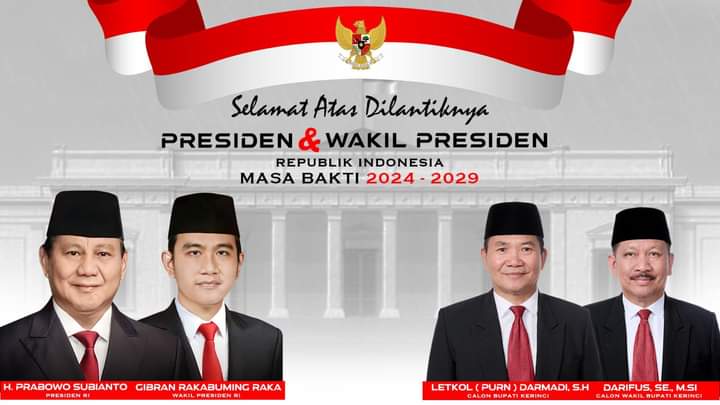Kerinci-Jambi//faktahukumnusantara.com-Calon bupati kerinci Letnan Kolonel Purnawirawan Darmadi. SH mengucapkan selamat dan sukses atas dilantiknya Presiden RI H.Prabowo Subianto dan Wakil Presiden RI Gibran Rakabuming Raka, di gedung DPR RI, Jakarta, Minggu (20/10/2024).