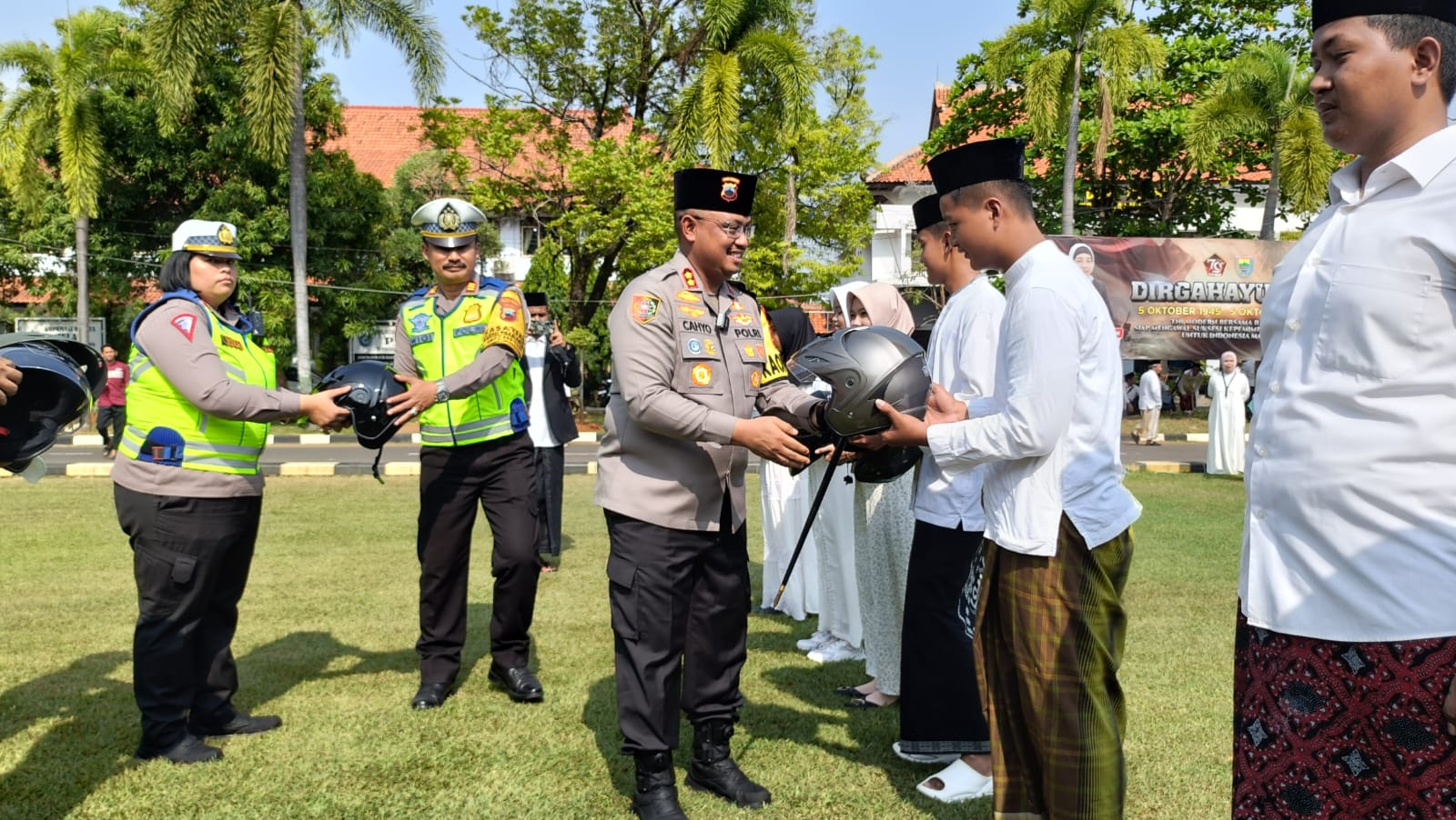“10 unit helm ini sebagai bentuk perhatian kami kepada para santri, sekaligus imbauan kepada para pengendara sepeda motor di jalan, untuk meningkatkan kesadaran tentang pentingnya memakai helm,” kata AKBP Nur Cahyo usai memimpin upacara, Selasa (22/10/2024).
