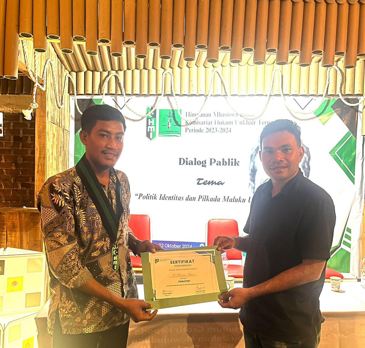 Ketua Bidang kewirausahaan dan pengembangan profesi (KPP) HMI Komisariat Hukum Unkhair Irfan D Manaf menyampaikan satu program kerjanya berupa dialog publik dengan tema “politik identitas dan pilkada maluku utara tahun 2024” Maksud dan tujuan dibuat dialog ini untuk memberikan edukasi kepada kita dan masyarakat untuk menjadi partisipan politik yang baik dan menjadi pemilih yang rasional untuk menentukan pemimpin,