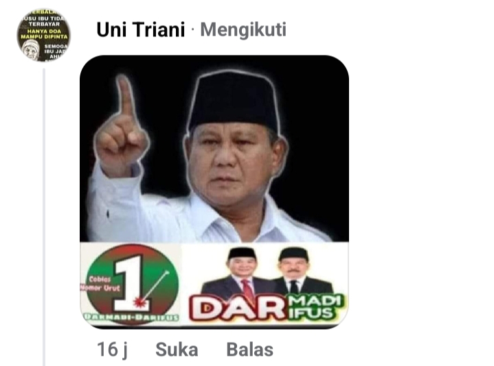 Artikel yang bernarasi Coblos nomor urut satu Darmadi-Darifus Foto Salah Konteks, Prabowo  Beri Dukungan pasangan ke Letkol Purn Darmadi dan Bapak Darifus di Pilkada kerinci”di bagikan oleh akun Facebook uni Triani itu di salah satu Komentar kolase foto editan yang menampilkan Prabowo mengajungkan satu jari dan sejumlah  dukungan kepada pasangan Darmadi-Darifus di mendapat responsif dari netizen pengguna Facebook.
