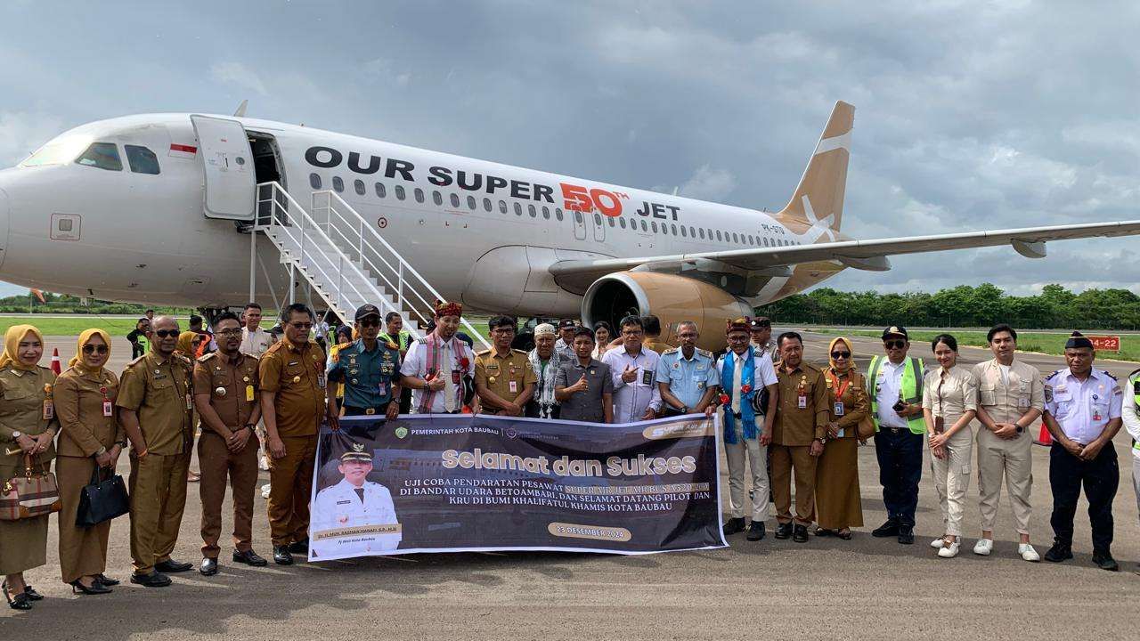 Uji coba pendaratan perdana pesawat berbadan lebar ini disaksikan langsung oleh sejumlah pejabat penting, termasuk Penjabat Sekretaris Daerah Kota Baubau, La Ode Aswad, Wakil Ketua DPRD Baubau, Adriandsyah Farmin, serta jajaran Forkopimda dan OPD.