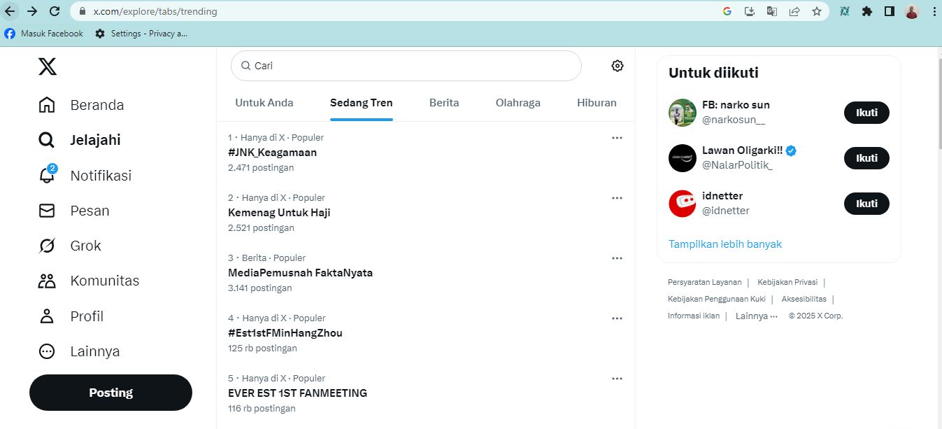 faktahukumnusantara.com-Antusiasme masyarakat terhadap penyelenggaraan ibadah haji tahun 2025 tampak jelas di media sosial. Hari ini, Sabtu, 10 Mei 2025 pukul 12.30 WIB, frasa kata kunci “Kemenag Untuk Haji” dan tagar #JNK_Keagamaan masuk jajaran top trending topic di Twitter Indonesia. Ribuan warganet menyuarakan dukungan, doa, dan rasa terima kasih atas dimulainya proses keberangkatan jamaah haji Indonesia ke Tanah Suci.