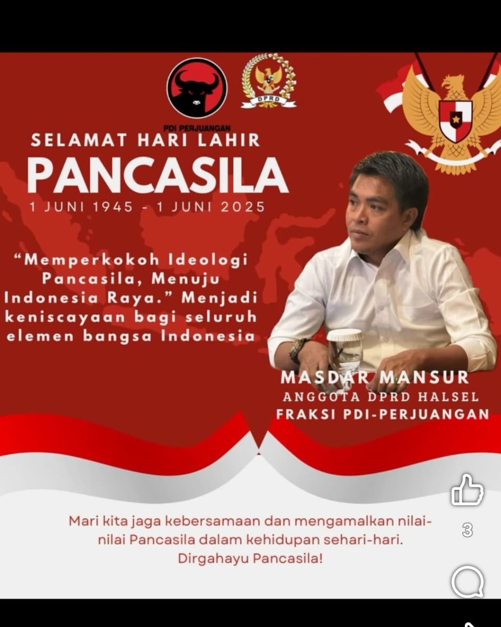 Halsel labuha //faktahukumnusantara.com-1 juni 2025 politisi PDIP mengajak generasi muda dan tokoh masyarakat untuk menjunjung tinggi nilai-nilai Pancasila sebagai pedoman bangsa. Berikut beberapa poin penting dari ajakan tersebut: