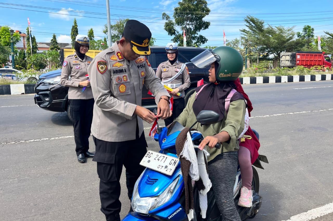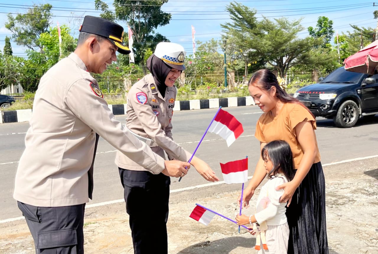 Tanamkan Cinta Tanah Air Sejak Dini, Kapolres Musi Rawas Bagikan Bendera Merah Putih Kepada Anak-Anak dan Pengendara