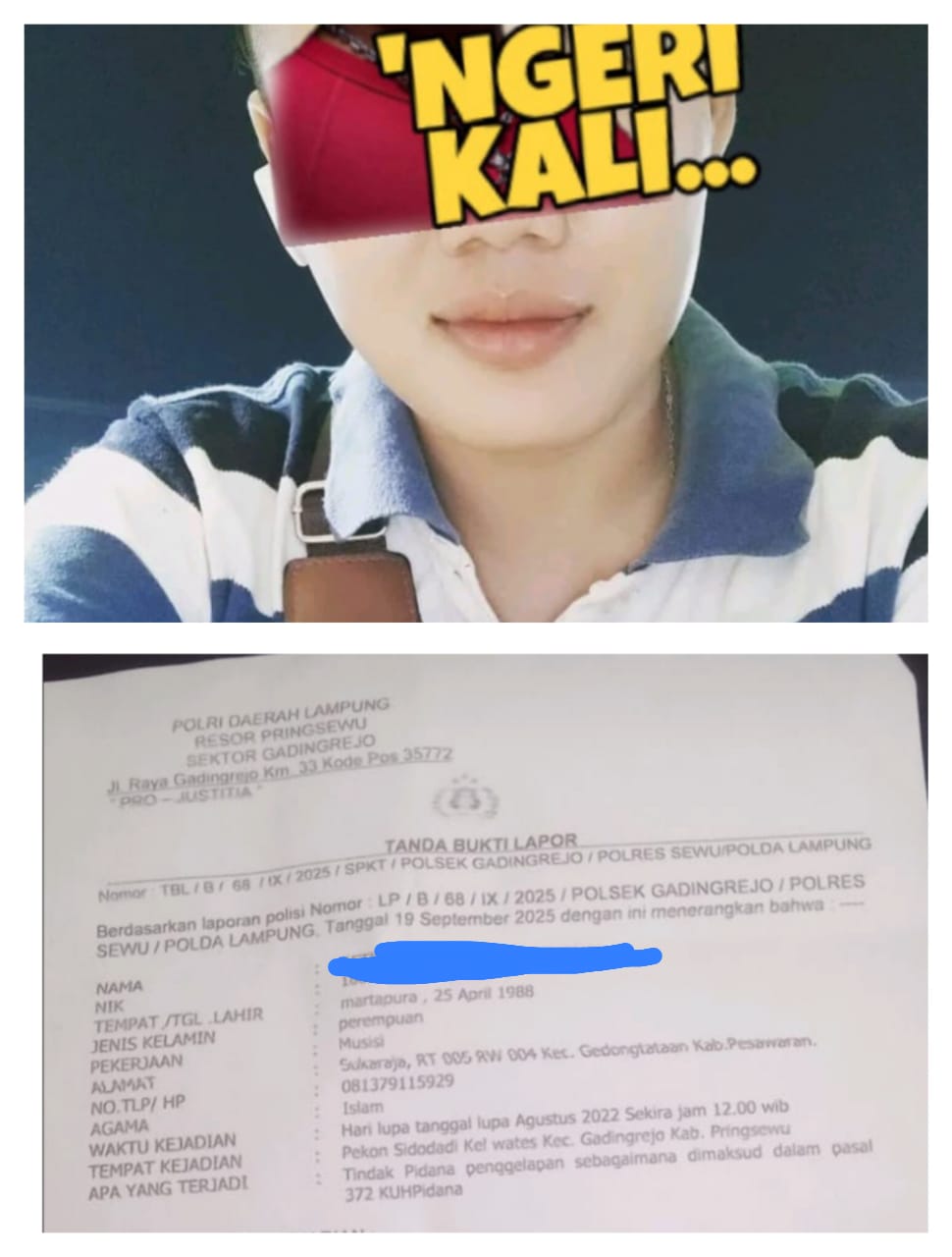 Tanggal 19 September 2025 Warga Desa Sukaraja, Kecamatan Gedong tataan, Kabupaten Pesawaran Lampung. RF korban Dugaan Tindak pidana Penggelapan, Resmi Melapor ke Polsek Gading Rejo.
