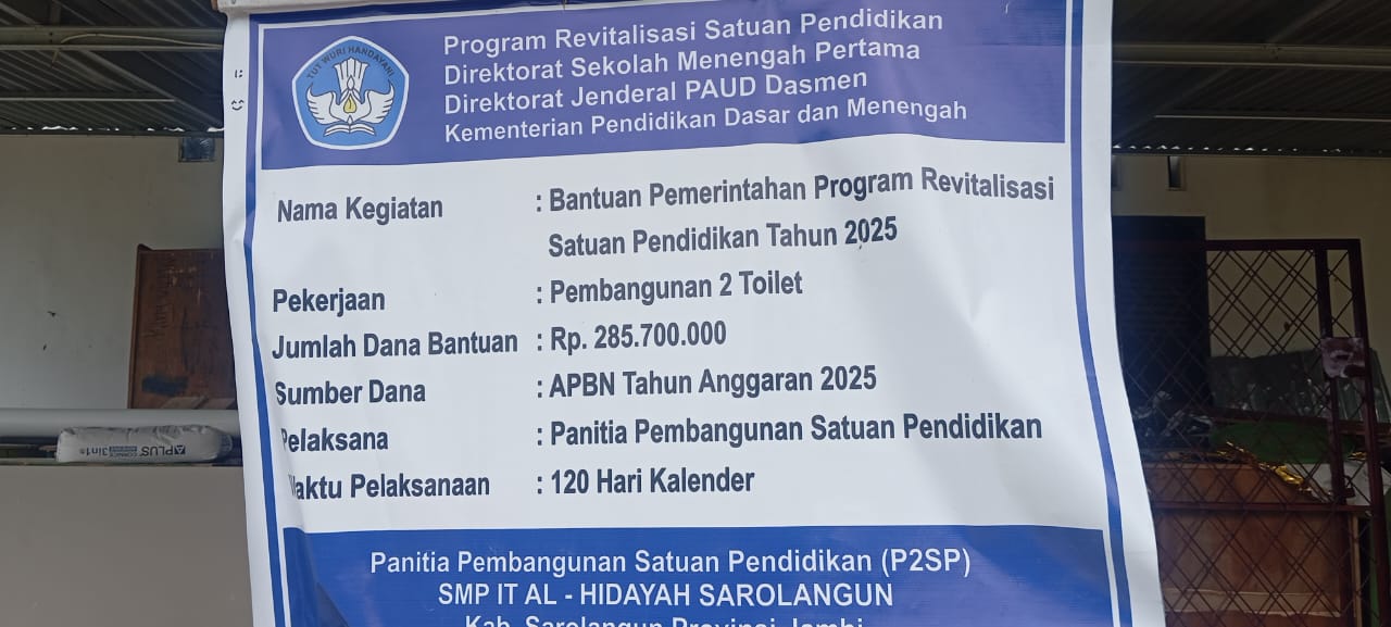 Sarolangun //faktahukumnusantara.com- Proyek pembangunan 2 toilet SMP IT Al-Hidayah, Kabupaten Sarolangun, Jambi, menuai sorotan. Dana bantuan pemerintah pusat melalui Program Revitalisasi Satuan Pendidikan Tahun 2025 sebesar Rp 285,7 juta.